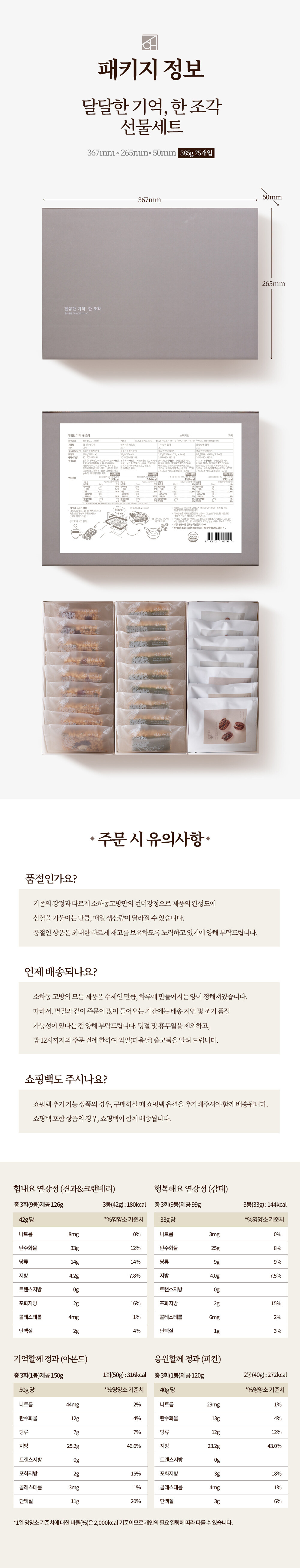 포장 불량 혹은 모양에 예쁘지 않은 것은 여러분에게 맛보시라고 넣어 드리고 있습니다. 하지만 덤은 덤일뿐, 필수는 아닙니다. 하나라도 더 챙겨드리고 싶은 것이 소하동 고방의 마음이기는 하나, 명절과 같은 특수한 기간에는 그 마음을 챙겨드릴 수가 없을 수도 있습니다. 양해 바랍니다.