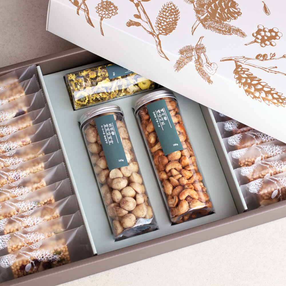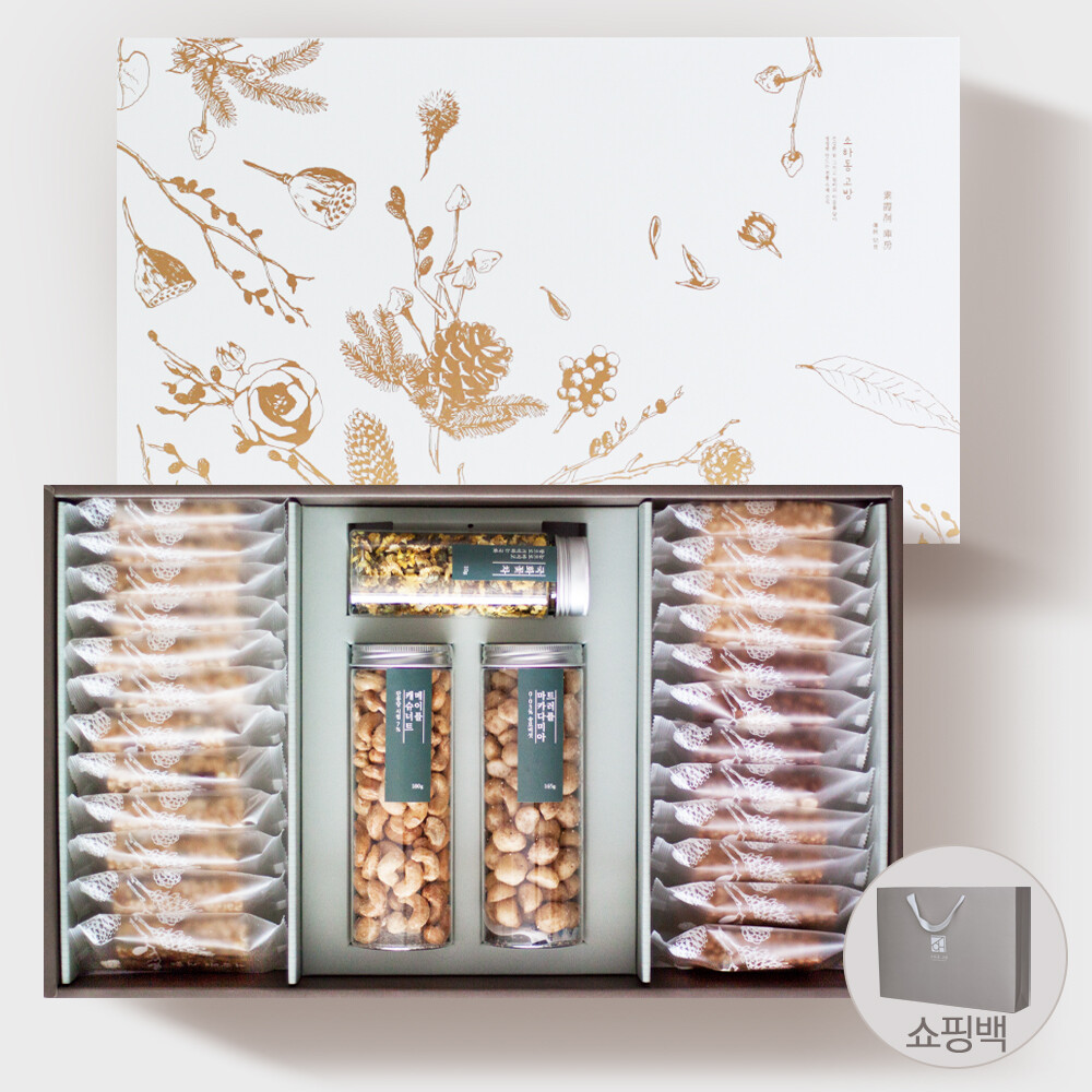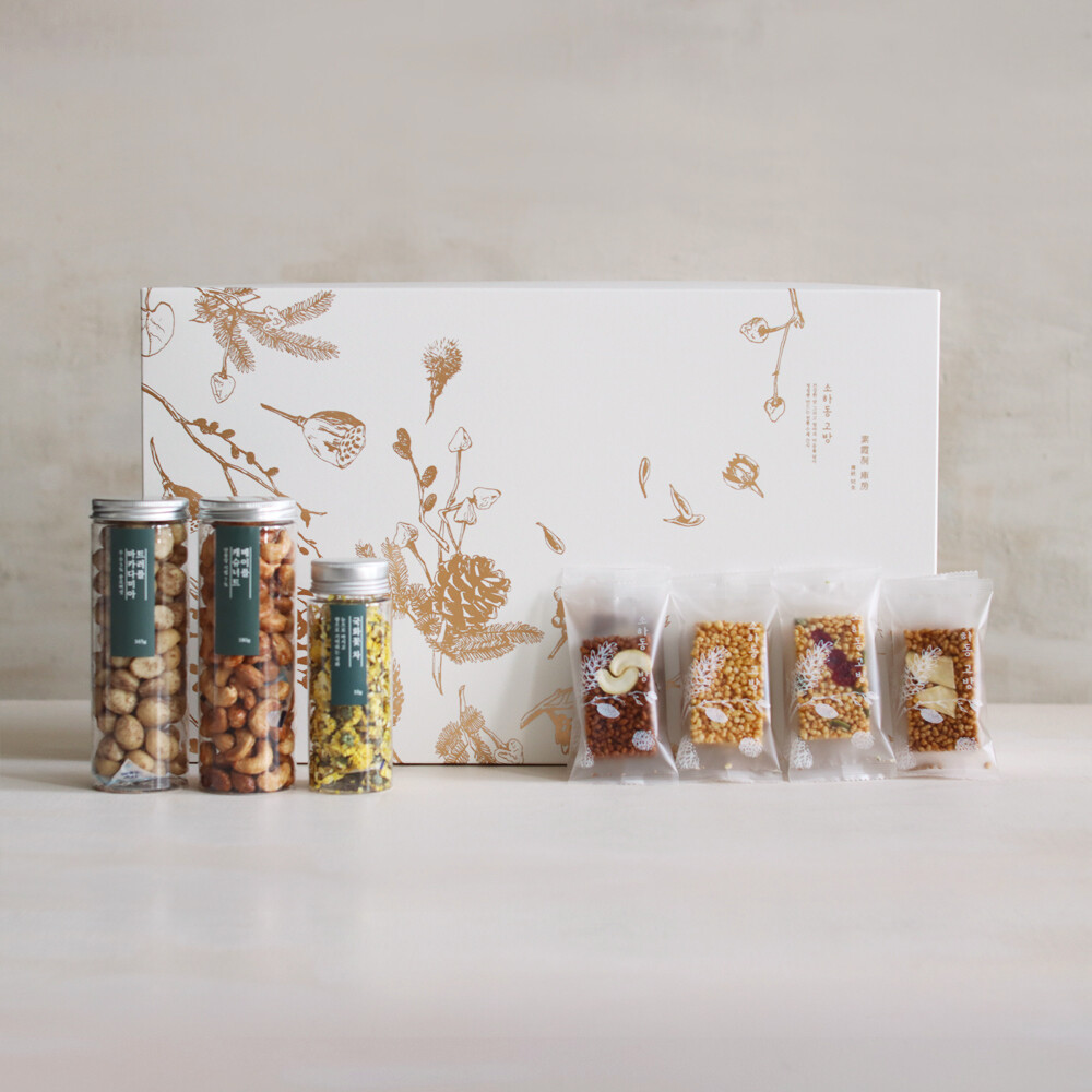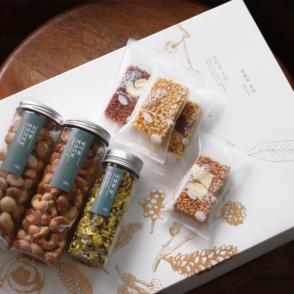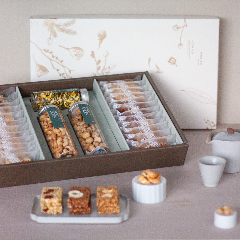 [소하동 고방] 마음을 더하다 726g 전통 수제 강정 4가지 맛, 견과류 2종 꽃차 1종 다과 선물세트