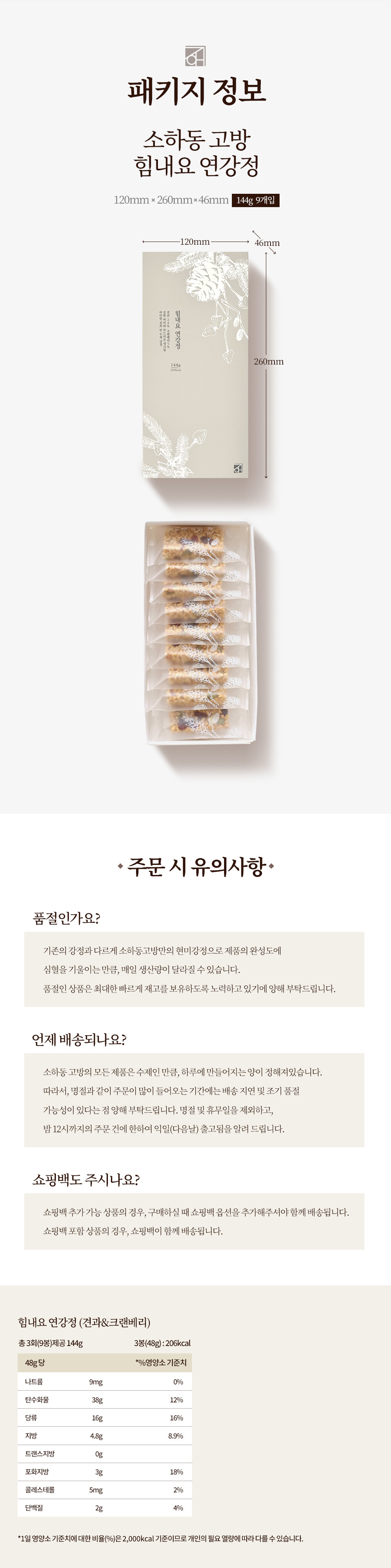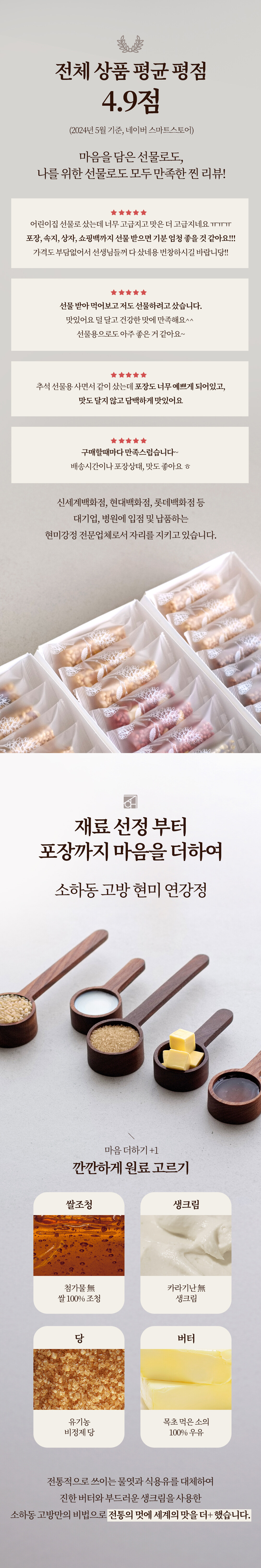 포장 불량 혹은 모양에 예쁘지 않은 것은 여러분에게 맛보시라고 넣어 드리고 있습니다. 하지만 덤은 덤일뿐, 필수는 아닙니다. 하나라도 더 챙겨드리고 싶은 것이 소하동 고방의 마음이기는 하나, 명절과 같은 특수한 기간에는 그 마음을 챙겨드릴 수가 없을 수도 있습니다. 양해 바랍니다.