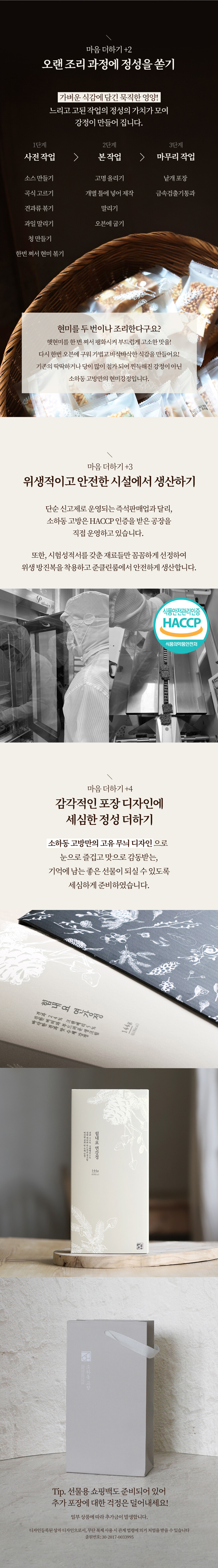 소하동 고방은 "많이" 보다 "제대로" 만들기 위해 심혈을 기울이고 있습니다. 따라서 매일 생산량이 달라질 수 있습니다. 이에 따른 품절 관련 전화문의는 정중히 사절합니다.