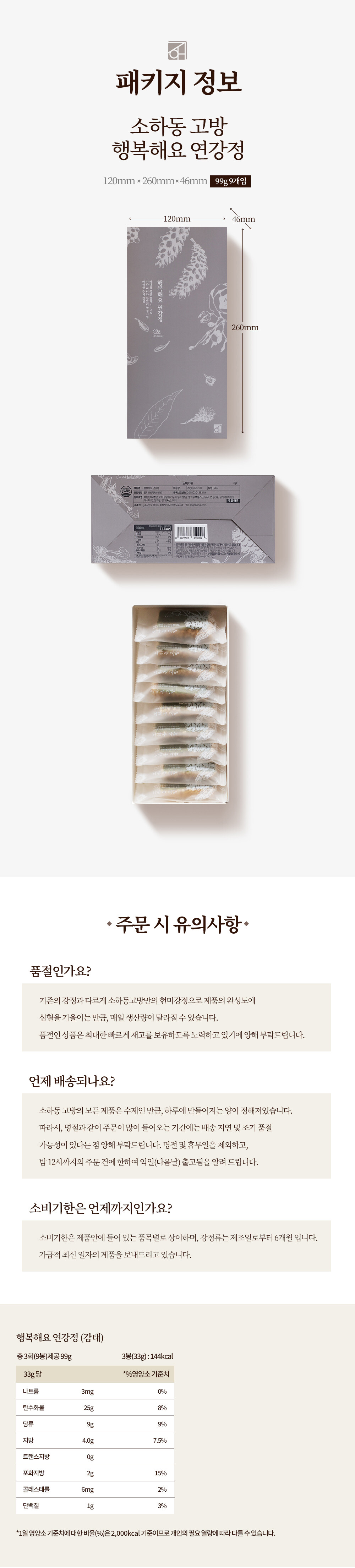 포장 불량 혹은 모양에 예쁘지 않은 것은 여러분에게 맛보시라고 넣어 드리고 있습니다. 하지만 덤은 덤일뿐, 필수는 아닙니다. 하나라도 더 챙겨드리고 싶은 것이 소하동 고방의 마음이기는 하나, 명절과 같은 특수한 기간에는 그 마음을 챙겨드릴 수가 없을 수도 있습니다. 양해 바랍니다.