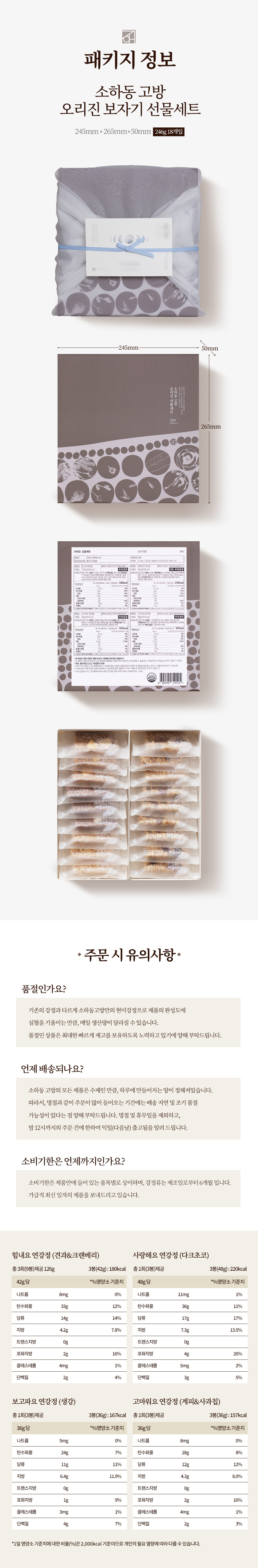포장 불량 혹은 모양에 예쁘지 않은 것은 여러분에게 맛보시라고 넣어 드리고 있습니다. 하지만 덤은 덤일뿐, 필수는 아닙니다. 하나라도 더 챙겨드리고 싶은 것이 소하동 고방의 마음이기는 하나, 명절과 같은 특수한 기간에는 그 마음을 챙겨드릴 수가 없을 수도 있습니다. 양해 바랍니다.