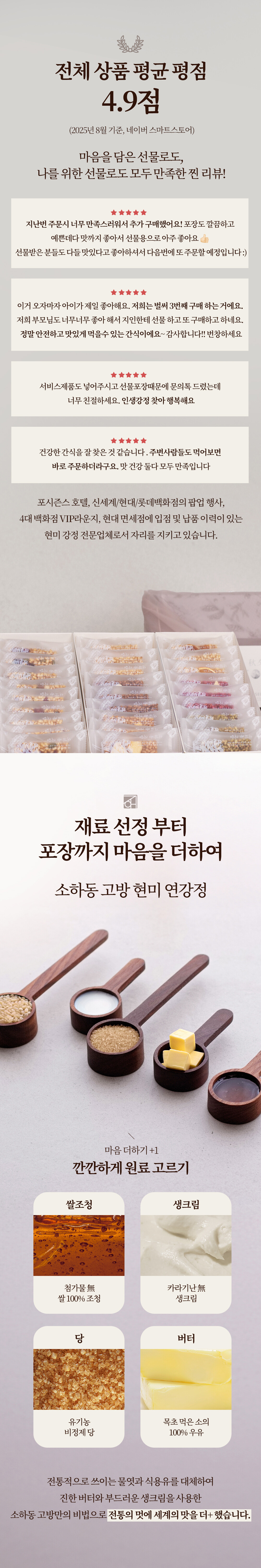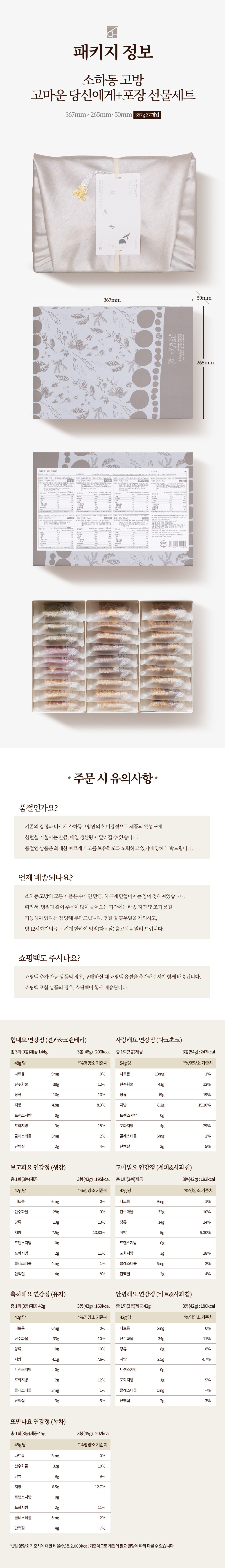 포장 불량 혹은 모양에 예쁘지 않은 것은 여러분에게 맛보시라고 넣어 드리고 있습니다. 하지만 덤은 덤일뿐, 필수는 아닙니다. 하나라도 더 챙겨드리고 싶은 것이 소하동 고방의 마음이기는 하나, 명절과 같은 특수한 기간에는 그 마음을 챙겨드릴 수가 없을 수도 있습니다. 양해 바랍니다.