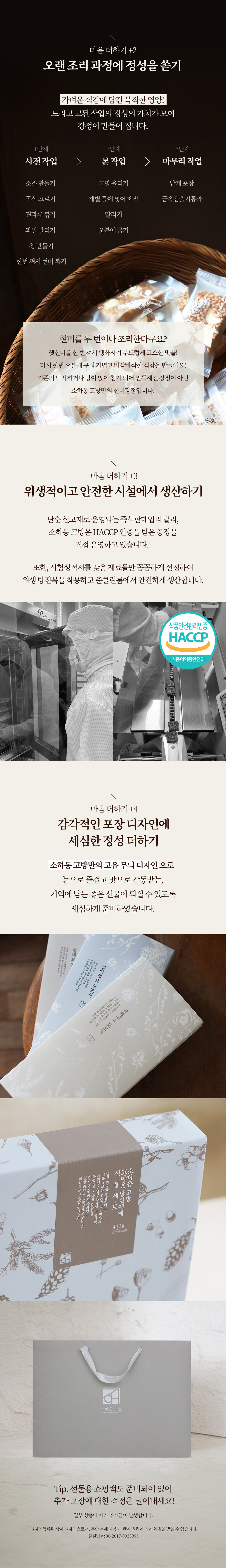 소하동 고방은 "많이" 보다 "제대로" 만들기 위해 심혈을 기울이고 있습니다. 따라서 매일 생산량이 달라질 수 있습니다. 이에 따른 품절 관련 전화문의는 정중히 사절합니다.